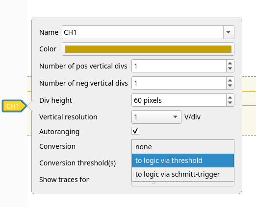 Here is our analog signal in Pulseview! But we need to configure pulseview to convert these analog pulses into digital values. In PulseView, there are several ways to convert your analog capture into digital pulses. For this example, we will select our channel CH1 and use the Logic via Threshold setting as shown in the image below:
