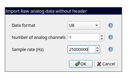 Next, select Import Raw Analog Data Without Header, which will open a file browser. For this example, we'll select the trace we just captured. Once a trace is selected, the following prompt will appear.